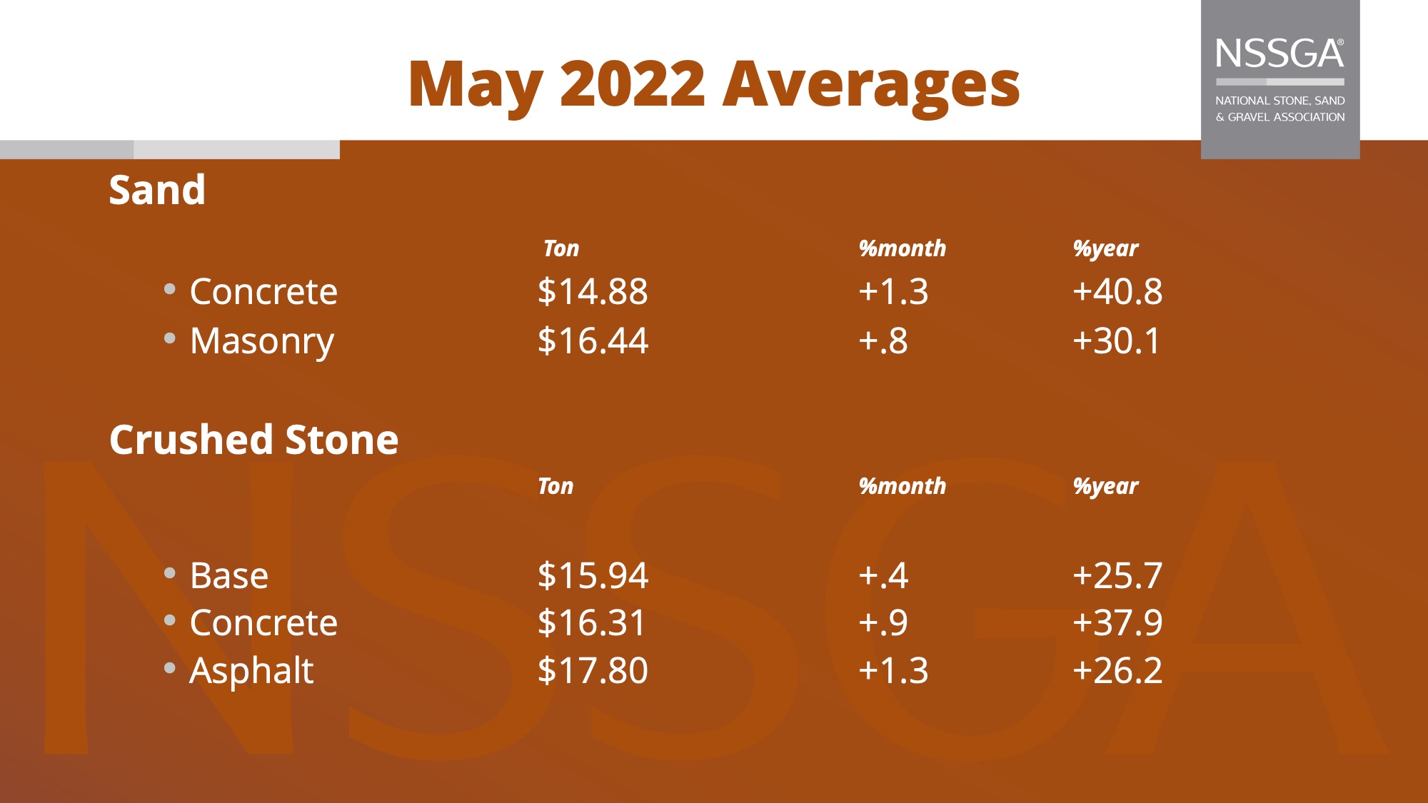 Michele Stanley, Vice President of Government and Regulatory Affairs for the National Stone, Sand & Gravel Association, shared the average prices for aggregate materials in May 2022 compared to 2021. Most notably, the cost of concrete sand is 40.8 percent higher than last year and masonry sand costs 30.1 percent more.